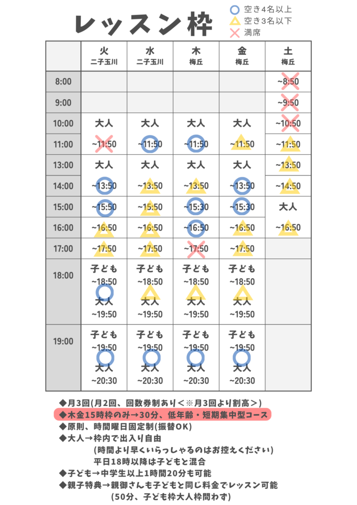 ※子どもは1回50分。但し木金15時枠のみ1回30分の低年齢・短期集中型コースとなりますのでご注意ください。